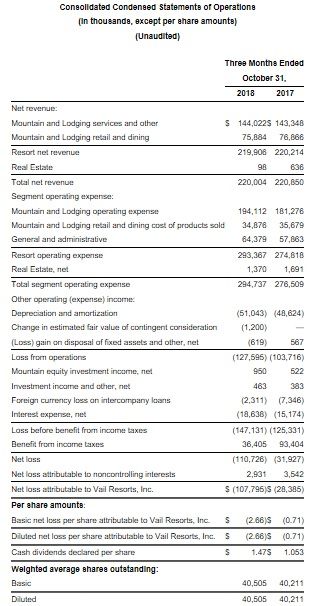 Vail Resorts, Inc. reported certain ski season metrics for the comparative periods from the beginning of the ski season through January 6, 2019, and for the prior year period through January 7, 2018. The reported ski seaso...