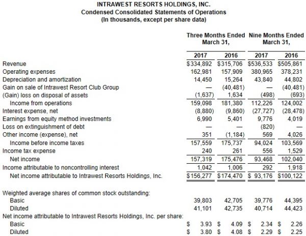Intrawest Reports Fiscal 2017 Third Quarter ResultsDENVER--- Intrawest Resorts Holdings, Inc. reported results for the three and nine months ended March 31, 2017. Third Quarter Highlights