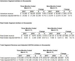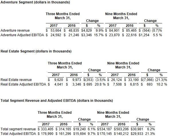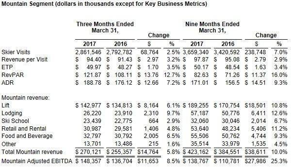"Third quarter results reflect our continued focus on growing pre-committed revenue streams, increases in yields, our ability to manage costs, and the impact of our growth capital investments," stated Tom Marano, Chief Executive Officer. "I want to thank all of our guests and our employees for another outstanding ski season." Three Months Ended March 31, 2017 Below are the Company's results for the three months ended March 31, 2017 as compared to the prior year period: Consolidated Results